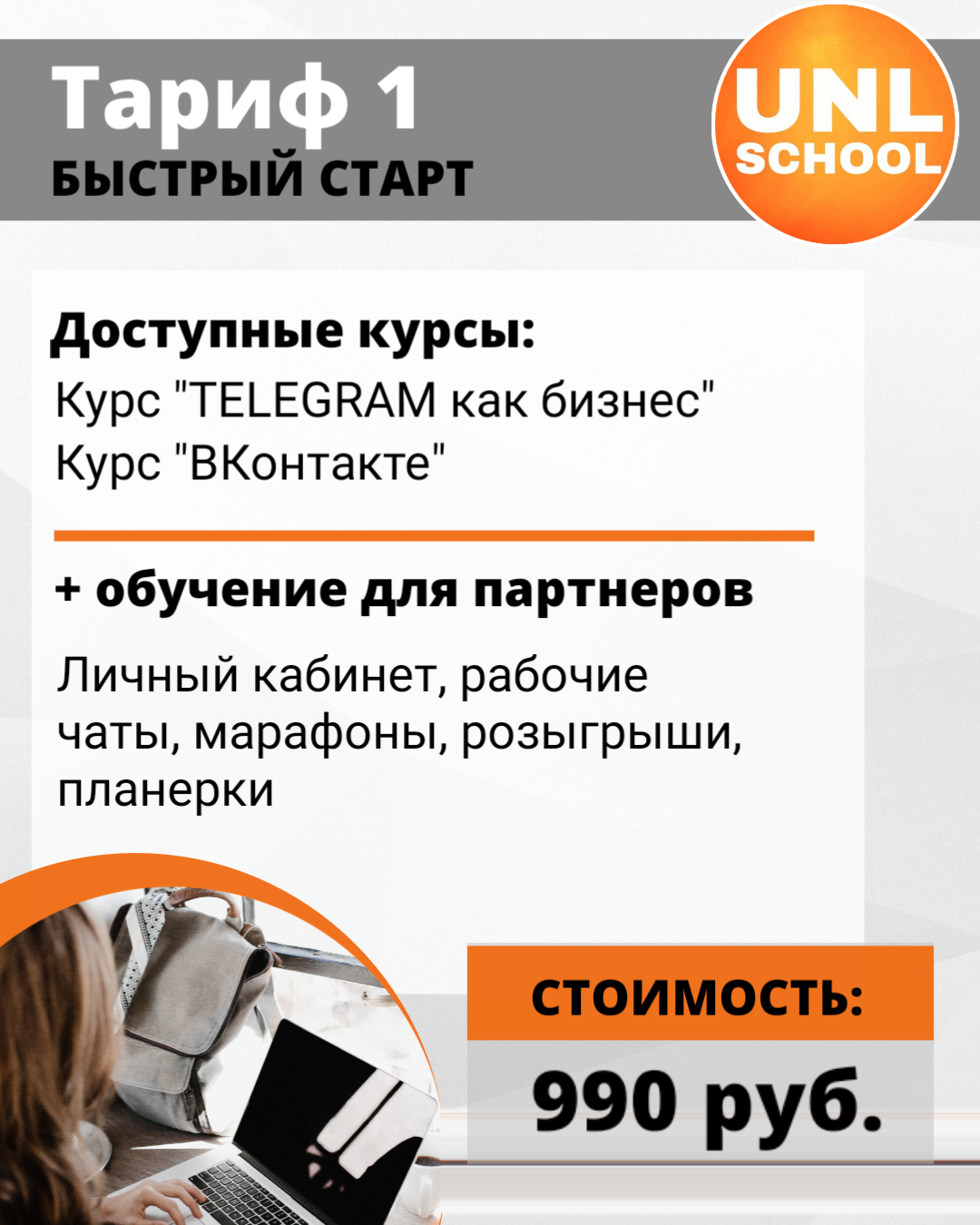 Тариф 1 включает в себя курс в телеграмм, курс в вконтакте, + обучение для партнеров + личный кабинет + рабочие чаты + возможность продажи любого тариф и отдельного курса.